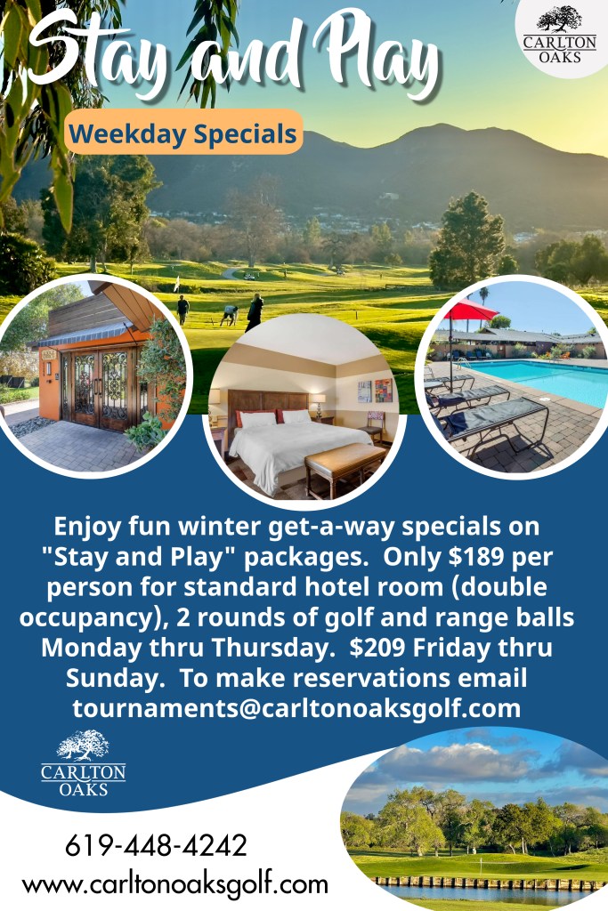 Save money in 2025 by pre-purchasing our new Carlton Oaks Round Cards. Only $449 for 10 weekday rounds (Monday through Friday), plus a bonus extra free round. A great deal for a total of 11 rounds for only $449. The Round Card can also be used on weekends for an additional $20 daily fee. Not valid on holidays or during special events. Contact the pro-shop at 619-448-8500 for more details.